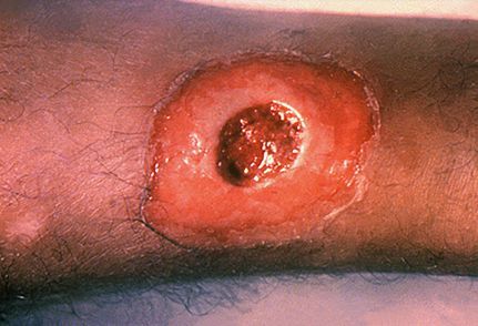 Bệnh bạch hầu ở da có thể được gây ra bởi các chủng C. diphtheriae có độc tính và không độc tính , mặc dù độc tính toàn thân rất hiếm. Bệnh bạch hầu ở da được đặc trưng bởi các vết loét mãn tính, không loét hoặc loét nông với màng xám bẩn; ngoại hình khá không đặc hiệu ( ảnh 3 ). Chấn thương tại chỗ thường xuyên trước nhiễm trùng da. Các đợt bùng phát bệnh da trước đây đã xảy ra ở nhóm dân số nghèo khó tiếp cận với hệ thống chăm sóc sức khỏe, chẳng hạn như những người lạm dụng thuốc không rõ nguồn gốc và tiêm tĩnh mạch.