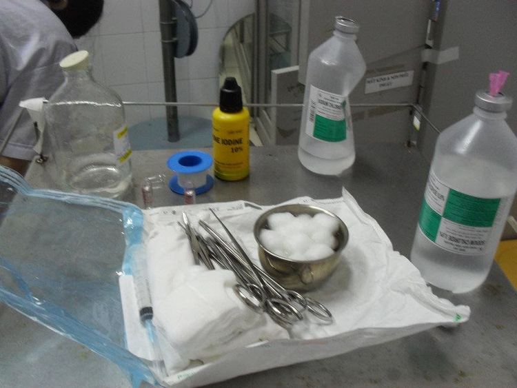 • Nỉa có mấu và không mấu, kéo cong, kéo thẳng, găng tay. Nên có sẵn những dụng cụ cầm máu như pince, kìm cầm kim...