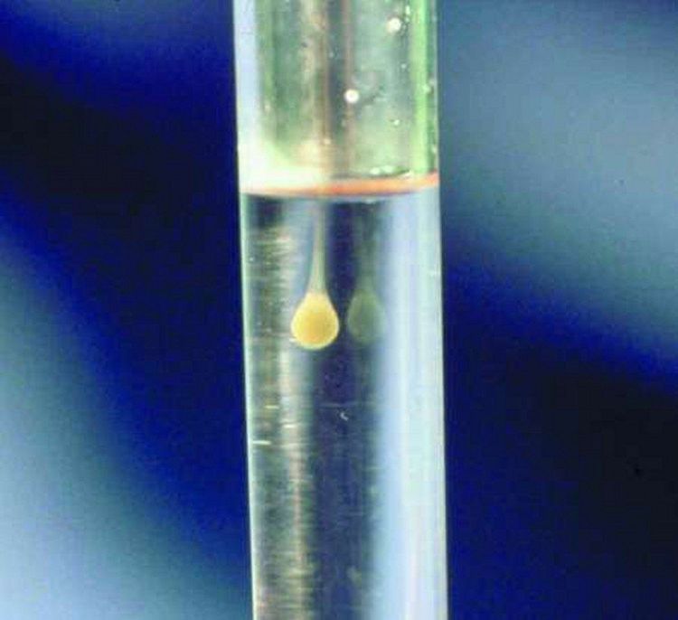 - Phản ứng dương tính: Nước cổ trướng nhỏ vào dần dần sẽ trở nên vẩn trắng đục lơ lửng trong cốc nước giống như khói thuốc lá. Như vậy là hiện tượng protein trong nước cổ trướng cao > 30g/lít và nguyên nhân gây nên cổ trướng thường là viêm hay u. Ta gọi chung là nước rỉ viêm.