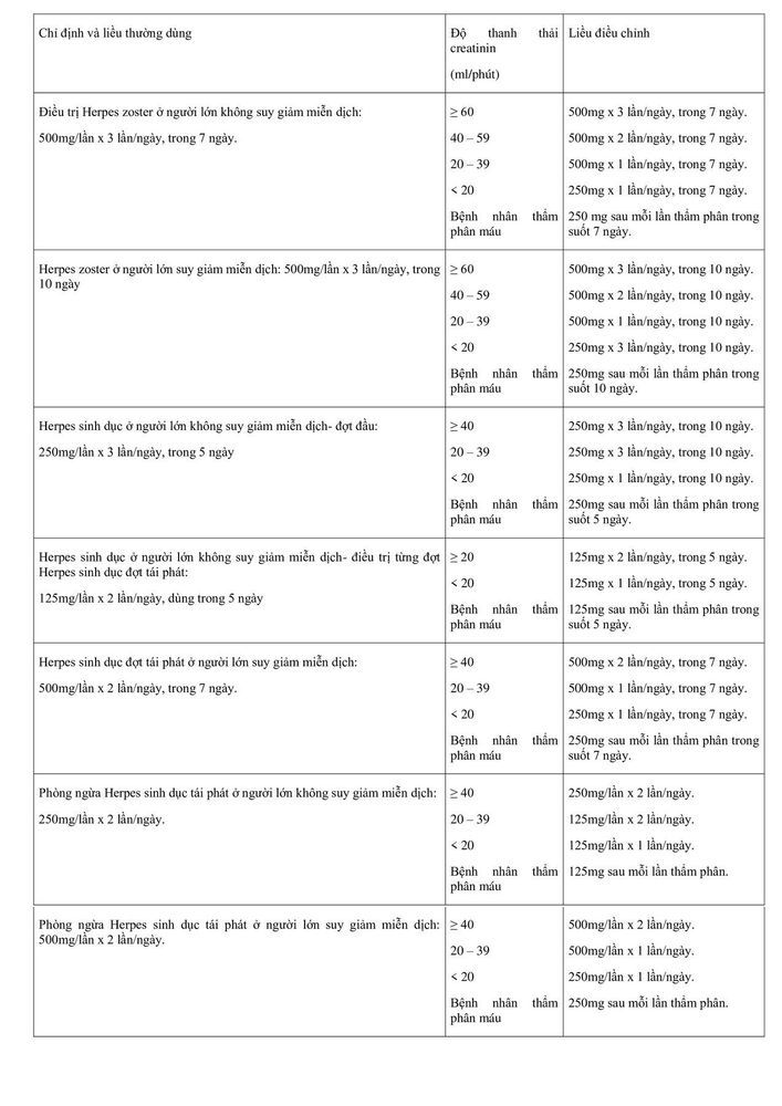 - Điều trị Herpes zoster ở người lớn suy giảm miễn dịch: 500mg/lần x 3 lần/ngày, dùng trong 10 ngày. Điều trị nên được khởi đầu sớm nhất có thể sau khi chẩn đoán Herpes zoster.