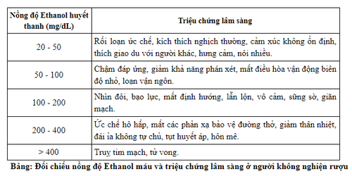 Trong rượu có chứa thành phần Ethanol và nhiều chất khác. Sau khi cơ thể dung nạp rượu thì nồng độ Ethanol sẽ tăng dần trong máu và lúc này Ethanol sẽ ức chế thần kinh trung ương. Nồng độ Ethanol trong máu ít tương quan với mức độ nhiễm độc do khả năng dung nạp tức là tùy thuộc vào tình trạng cơ thể của từng người và lượng rượu đã uống. Trung bình, người không nghiện rượu chuyển hóa Ethanol với tốc độ 20 mg/dL/giờ, trong khi những người nghiện rượu mạn tính chuyển hóa Ethanol với tốc độ 30 mg/dL/giờ.