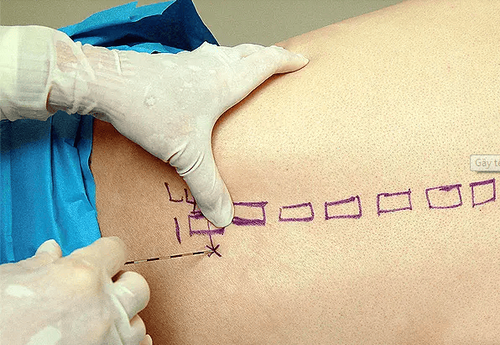 + Đường giữa: Chọc kim gây tê tủy sống vào khe giữa 2 đốt sống, vị trí từ L2-L3 đến L4-L5.