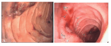 Ở những bệnh nhân này có các triệu chứng bụng rõ ràng, nội soi được coi là một công cụ hữu ích để xác định chẩn đoán và loại trừ các trường hợp cấp cứu ngoại khoa khác. Người ta báo cáo rằng tá tràng là vị trí tổn thương phổ biến nhất, các vị trí khác như dạ dày, thân vị và các góc bờ cong, nhưng không bao giờ là tâm vị hoặc thực quản. Các phát hiện qua nội soi bao gồm sung huyết, phù nề, chấm xuất huyết, loét và các tổn thương nội mạc khác bao gồm các phát hiện nội soi thường gặp của ban xuất huyết Henoch-Schonlein. Những biểu hiện này ít nhiều trùng lặp với những biểu hiện nhiễm H. pylori, do đó việc phát hiện vi khuẩn là rất quan trọng trong việc điều trị một số bệnh nhân.