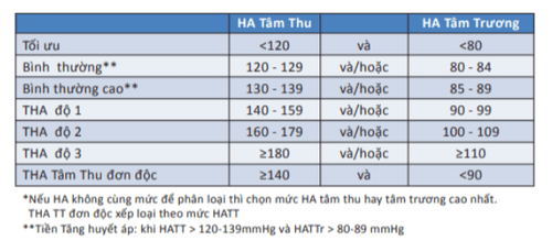 Theo khuyến cáo chẩn đoán và điều trị tăng huyết áp (THA) của Hội tim mạch học quốc gia Việt nam năm 2018, chẩn đoán tăng huyết áp khi đo huyết áp phòng khám có huyết áp tâm thu ≥ 140mmHg và/hoặc huyết áp tâm trương ≥90mmHg, còn tăng huyết áp khi đo huyết áp tại nhà khi có huyết áp tâm thu ≥ 135 mmHg và/hoặc huyết áp tâm trương ≥ 85 mmHg. Phân độ tăng huyết áp khi đo tại phòng khám như bảng sau:
