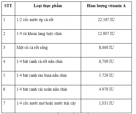 Dưới đây là danh sách một số loại thực phẩm được sắp xếp theo hàm lượng vitamin A giảm dần tính theo đơn vị đo lường quốc tế IU: