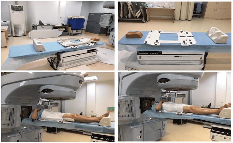 Đối với bộ dụng cụ cố định vùng tiểu khung không có dử dụng Vac-lock bao gồm: gối kê đầu Head-rest, bàn cố định bệnh nhân vùng tiểu khung, mặt nạ cố định vùng tiểu khung và cố định chân Feet-Fix (CIVCO, Orange city, IA). Bệnh nhân được chuẩn bị bàng quang với thể tích trung bình 350ml trước xạ trị đảm bảo bàng quang căng và bệnh nhân thoải mái trong quá trình nằm trên bàn máy điều trị cũng như khi lắp mặt nạ cố định vùng bụng cho bệnh nhân. Tư thế người bệnh nằm ngửa trên bàn máy và hai tay đặt lên trước ngực, đánh dấu Origin cố định trên Vac-lock và ghi thông số trên bàn cố định tiểu khung, xăm 3 dấu chì làm origin trên da bệnh nhân.